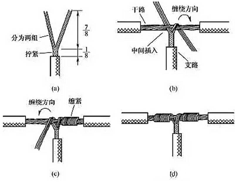 另一種方法如圖8所示,將支路芯線靠近絕緣層的約1/8芯線絞合擰緊,其余7/8芯線分為兩組[見圖8(a)],一組插入干路芯線當(dāng)中,另一組放在干路芯線前面,并朝右邊按圖8(b)所示方向纏繞 4~5圈。再將插入干路芯線當(dāng)中的那一組朝左邊按圖8(c)所示方向纏繞4~5圈,連接好的導(dǎo)線如圖8(d)所示。lQo拖鏈電纜-聚氨酯卷筒電纜-高柔性坦克鏈電纜廠家