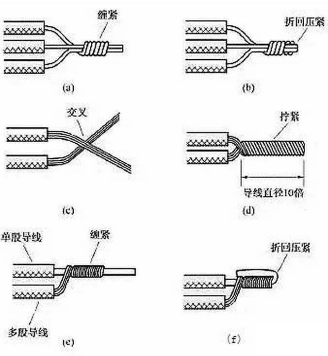 (6)同一方向的導(dǎo)線的連接。當(dāng)需要連接的導(dǎo)線來自同一方向時,可以采用圖10所示的方法。對于單股導(dǎo)線,可將一根導(dǎo)線的芯線緊密纏繞在其他導(dǎo)線的芯線上,再將其他芯線的線頭折回壓緊即可。對于多股導(dǎo)線,可將兩根導(dǎo)線的芯線互相交叉,然后絞合擰緊即可。對于單股導(dǎo)線與多股導(dǎo)線的連接,可將多股導(dǎo)線的芯線緊密纏繞在單股導(dǎo)線的芯線上,再將單股芯線的線頭折回壓緊即可。lQo拖鏈電纜-聚氨酯卷筒電纜-高柔性坦克鏈電纜廠家