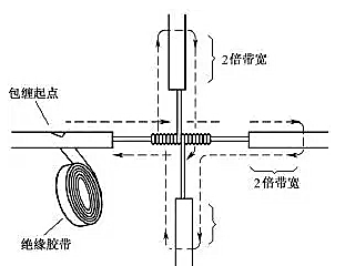 對導(dǎo)線的十字分支接頭進行絕緣處理時,包纏方向如圖22所示,走一個十字形的來回,使每根導(dǎo)線上都包纏兩層絕緣膠帶,每根導(dǎo)線也都應(yīng)包纏到完好絕緣層的兩倍膠帶寬度處。lQo拖鏈電纜-聚氨酯卷筒電纜-高柔性坦克鏈電纜廠家