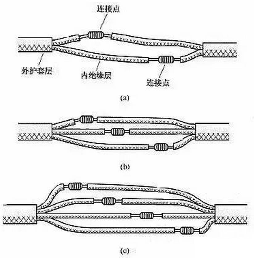 (7)雙芯或多芯電線電纜的連接。雙芯護套線、三芯護套線或電纜、多芯電纜在連接時,應(yīng)注意盡可能將各芯線的連接點互相錯開位置,可以更好地防止線間漏電或短路。圖11(a)所示為雙芯護套線的連接情況,圖 11(b)所示為三芯護套線的連接情況,圖11(c)所示為四芯電力電纜的連接情況。lQo拖鏈電纜-聚氨酯卷筒電纜-高柔性坦克鏈電纜廠家