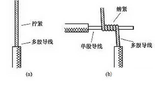 (5)單股銅導(dǎo)線與多股銅導(dǎo)線的連接。單股銅導(dǎo)線與多股銅導(dǎo)線的連接方法如圖9所示,先將多股導(dǎo)線的芯線絞合擰緊成單股狀,再將其緊密纏繞在單股導(dǎo)線的芯線上5~8圈,最后將單股芯線線頭折回并壓緊在纏繞部位即可。lQo拖鏈電纜-聚氨酯卷筒電纜-高柔性坦克鏈電纜廠家