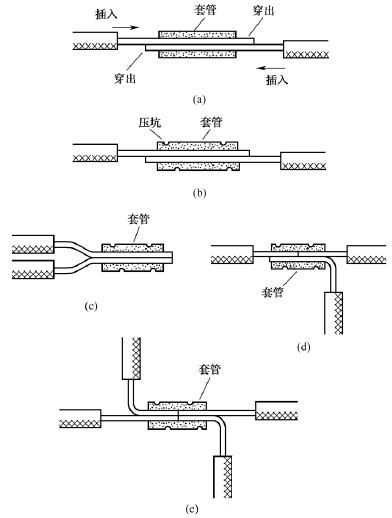 橢圓截面套管使用時,將需要連接的兩根導(dǎo)線的芯線分別從左右兩端相對插入并穿出套管少許,如圖14(a)所示,然后壓緊套管即可,如圖14(b)所示。橢圓截面套管不僅可用于導(dǎo)線的直線壓接,而且可用于同一方向?qū)Ь€的壓接,如圖14(c)所示;還可用于導(dǎo)線的T字分支壓接或十字分支壓接,如圖14(d)和圖14(e)所示。lQo拖鏈電纜-聚氨酯卷筒電纜-高柔性坦克鏈電纜廠家