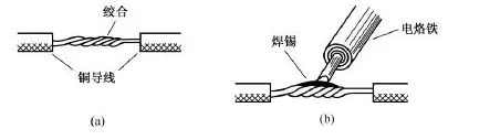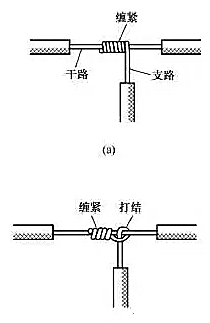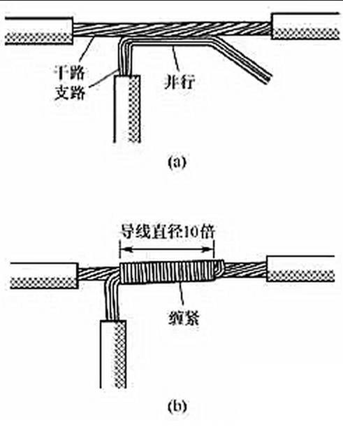 (4)多股銅導(dǎo)線的分支連接。多股銅導(dǎo)線的T字分支連接有兩種方法,一種方法是將支路芯線90°折彎后與干路芯線并行[見圖7(a)],然后將線頭折回并緊密纏繞在芯線上即可[見圖7(b)]。lQo拖鏈電纜-聚氨酯卷筒電纜-高柔性坦克鏈電纜廠家