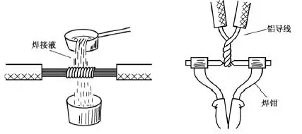 較粗(一般指截面16mm2以上)的銅導(dǎo)線接頭可用澆焊法連接。澆焊前同樣應(yīng)先清除銅芯線接頭部位的氧化層和黏污物,涂上無酸助焊劑,并將線頭絞合。將焊錫放在化錫鍋內(nèi)加熱熔化,當(dāng)熔化的焊錫表面呈磷黃色說明錫液已達符合要求的高溫,即可進行澆焊。澆焊時將導(dǎo)線接頭置于化錫鍋上方,用耐高溫勺子盛上錫液從導(dǎo)線接頭上面澆下,如圖14所示。剛開始澆焊時因?qū)Ь€接頭溫度較低,錫液在接頭部位不會很好滲入,應(yīng)反復(fù)澆焊,直至完全焊牢為止。澆焊的接頭表面也應(yīng)光潔平滑。lQo拖鏈電纜-聚氨酯卷筒電纜-高柔性坦克鏈電纜廠家